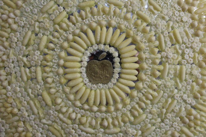 Material: Glasplatte, Spiegel, Nudeln, Applezeichen, Goldfarbe, Lack